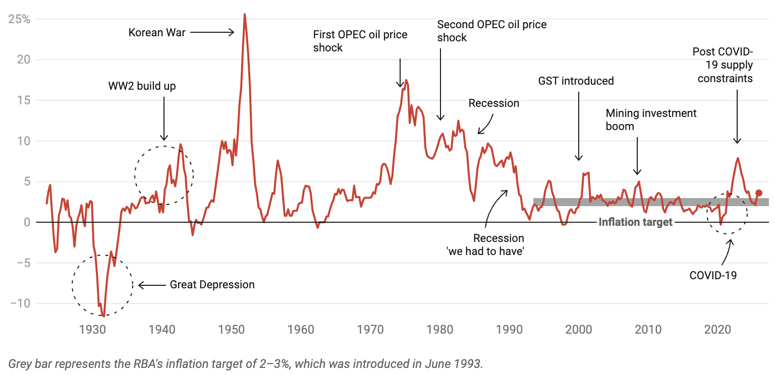The RBA is responsible for dealing with inflation. It does so by raising or lowering the official cash rate, which changes the interest rates we all pay. That flows through to borrowing costs across the economy for households and businesses, and thus influences demand.